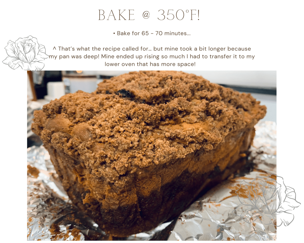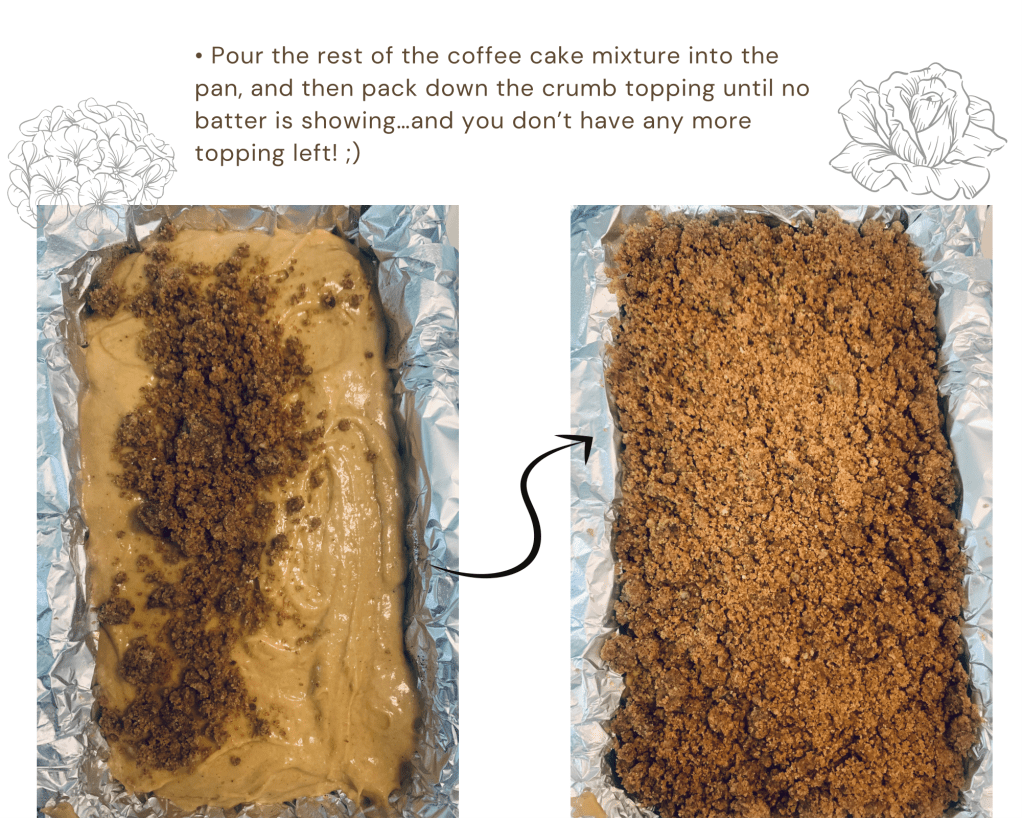 **TIP: When placing the crumble mixture on top, gently press and pack it down into the coffee cake mixture. I’ve always sprinkled it on top…but by pressing it down into the mixture, you get a thick topping (my favorite part)!